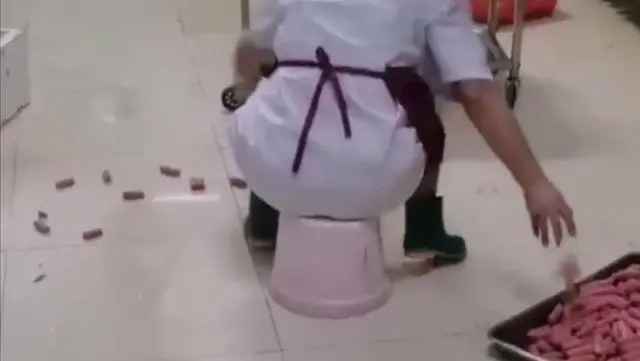 有一个食堂员工打扮的工作人员,慢悠悠把洒落一地的香肠捡到盘子里,旁边走过的人都穿着鞋子,如果把香肠捡起来清洗干净可能还好,如果没清洗干净的话那不是有些太脏了呢?